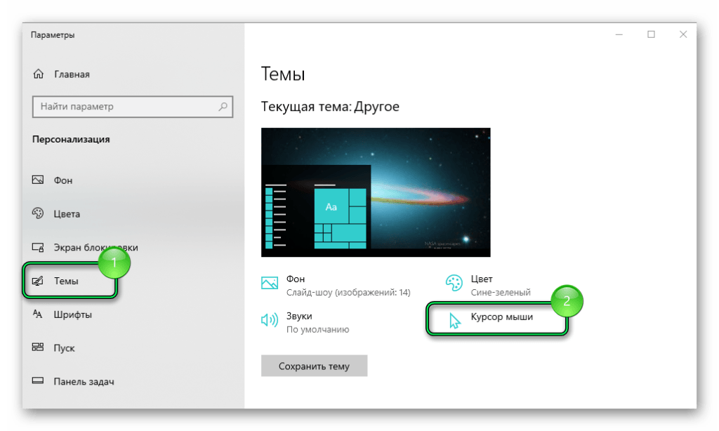 Примечание: если после перезапуска компьютера, Вы наблюдаете старый курсор. Проделайте шаги выше еще раз и сохраните текущую тему еще раз.