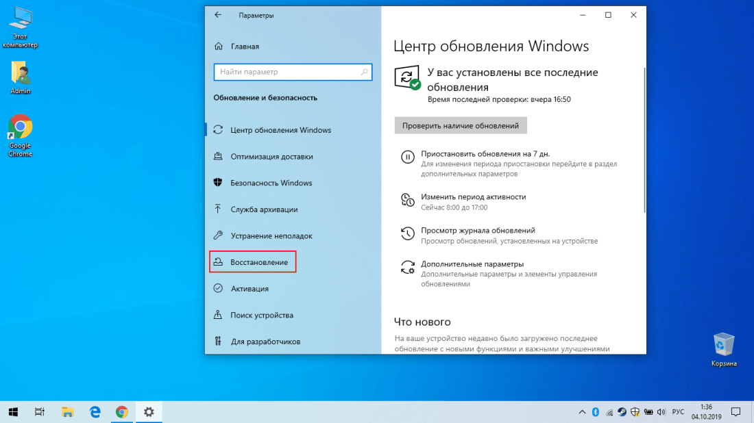 2 — В левом меню выберите пункт «Восстановление» (Рис.2).
