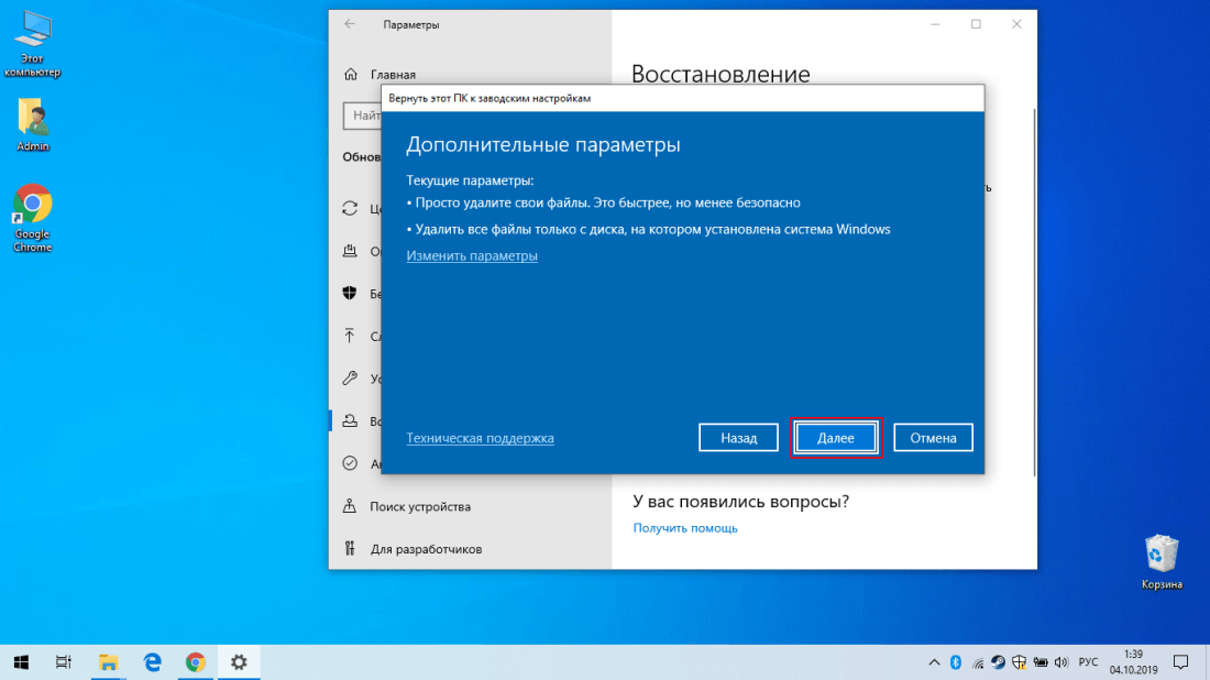 6. В окне «Дополнительные параметры» вас ознакомят с тем, что именно будет удалено и загружено во время сброса Windows. Где нужно нажать «Далее».