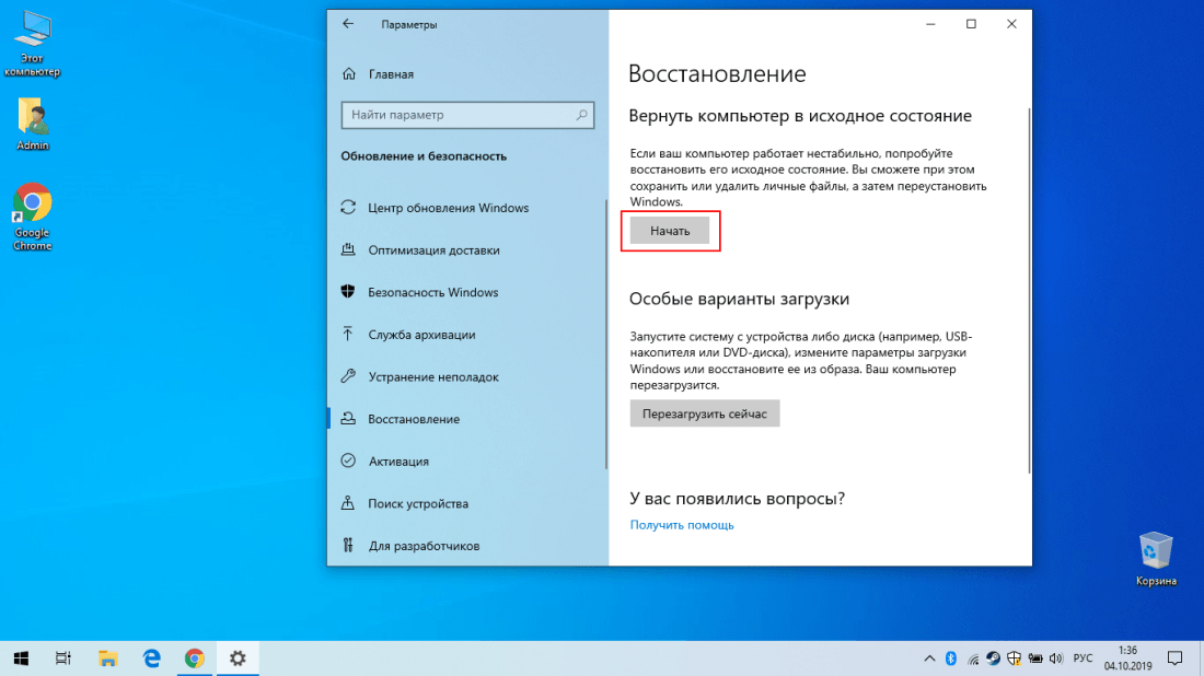 3 — Нажимаем на кнопку «Начать» под надписью «Вернуть компьютер в исходное состояние» (Рис.3).