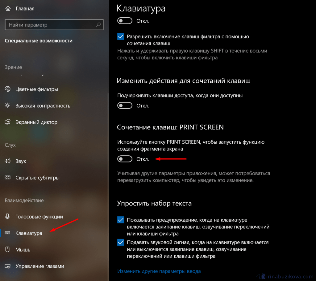 Еще назначать открытие программы Набросок на фрагменте экрана на клавишу Print Screen можно через меню Параметры – Специальные возможности – Клавиатура.