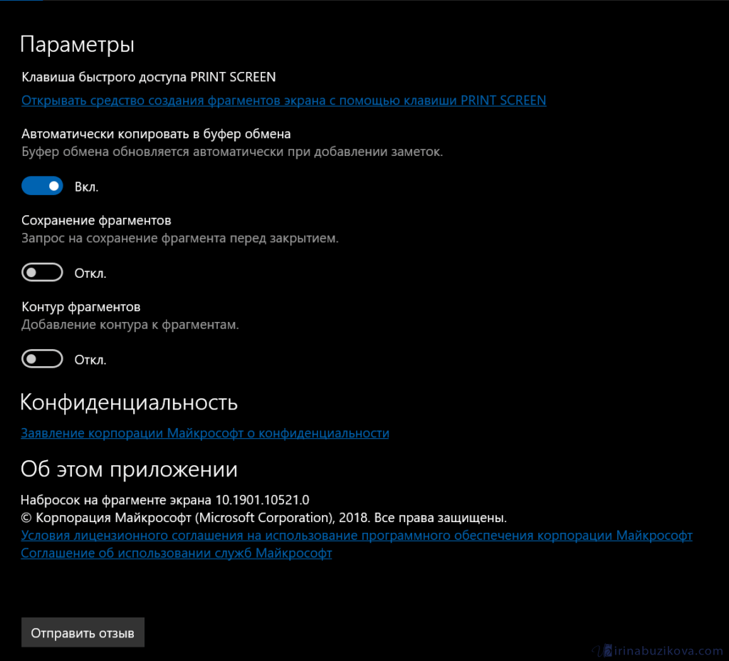В параметрах программы Набросок на фрагменте экрана – можно назначить открытие этой утилиты по нажатию кнопки Print Screen или оставить по умолчанию сочетание Shift+Windows+S.