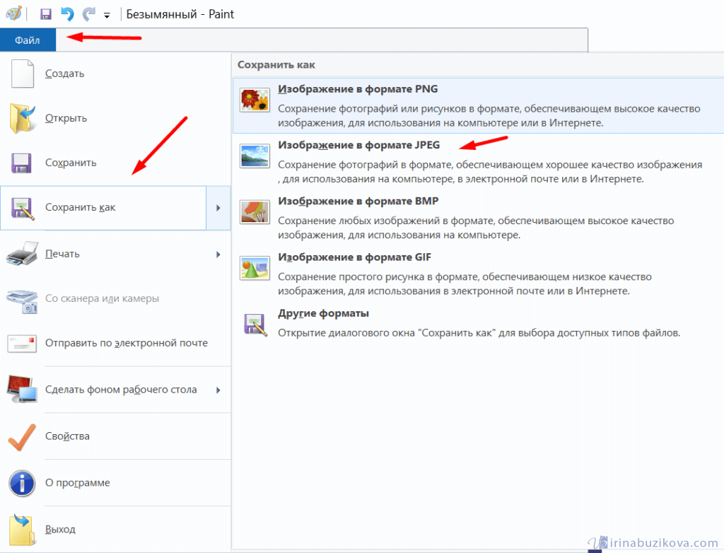 Затем меню Файл, выбираем пункт Сохранить как и далее щелкаем по нужному формату изображения. Доступны следующие: .png, .jpeg, .bmp, .gif.