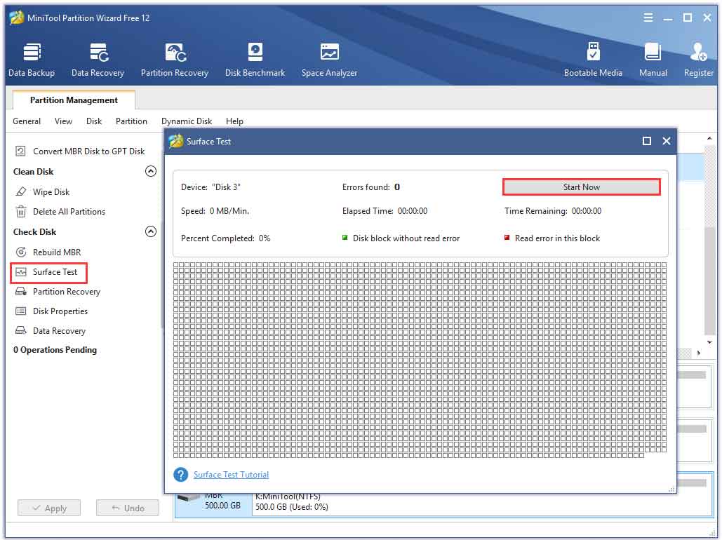 Step 2. Click the Start Now button on the pop-up window. After that, MiniTool will scan the whole hard disk automatically. If there are any bad sectors, they will be marked with red color.