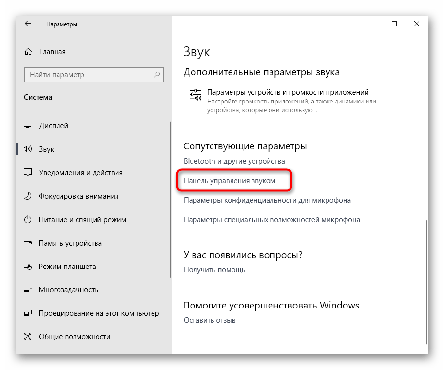 Отыщите надпись «Панель управления звуком» и нажмите по ней ЛКМ.