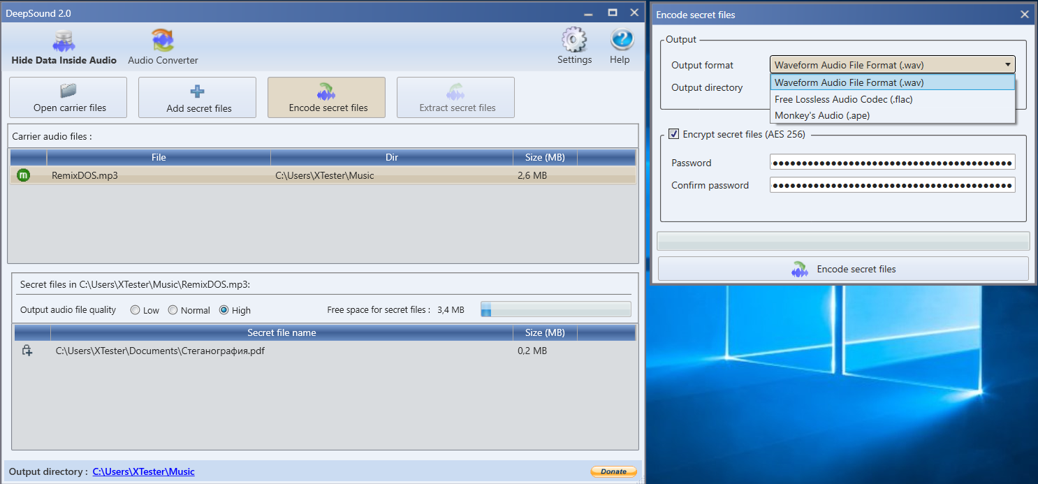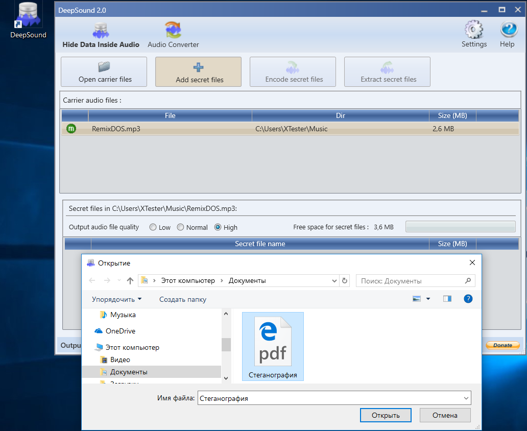 Последняя версия этой программы вышла в ноябре 2015 года. В отличие от предыдущих утилит в этом обзоре, она прячет данные внутри звуковых файлов. В качестве контейнеров DeepSound может использовать WAV (только несжатый, PCM), а также MP3, CDA, WMA, APE и FLAC. DeepSound умеет внедрять файлы любого типа и автоматически рассчитывает доступное для них место в зависимости от размера контейнера и настроек качества аудио.