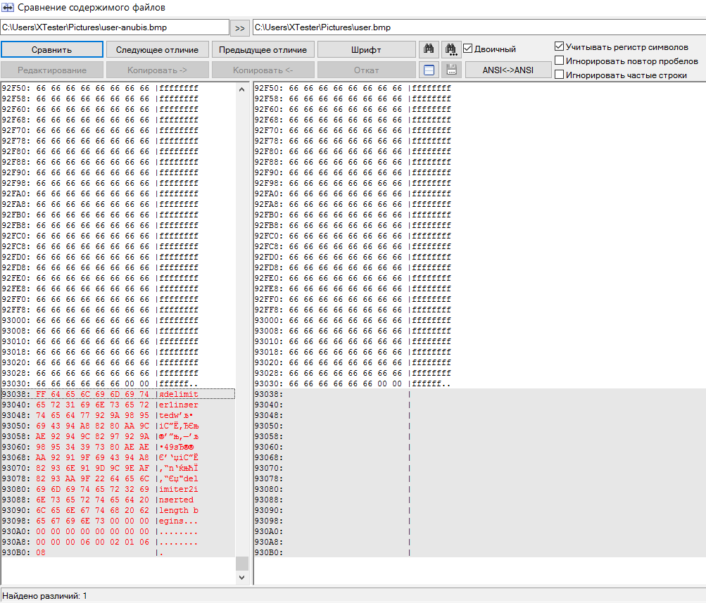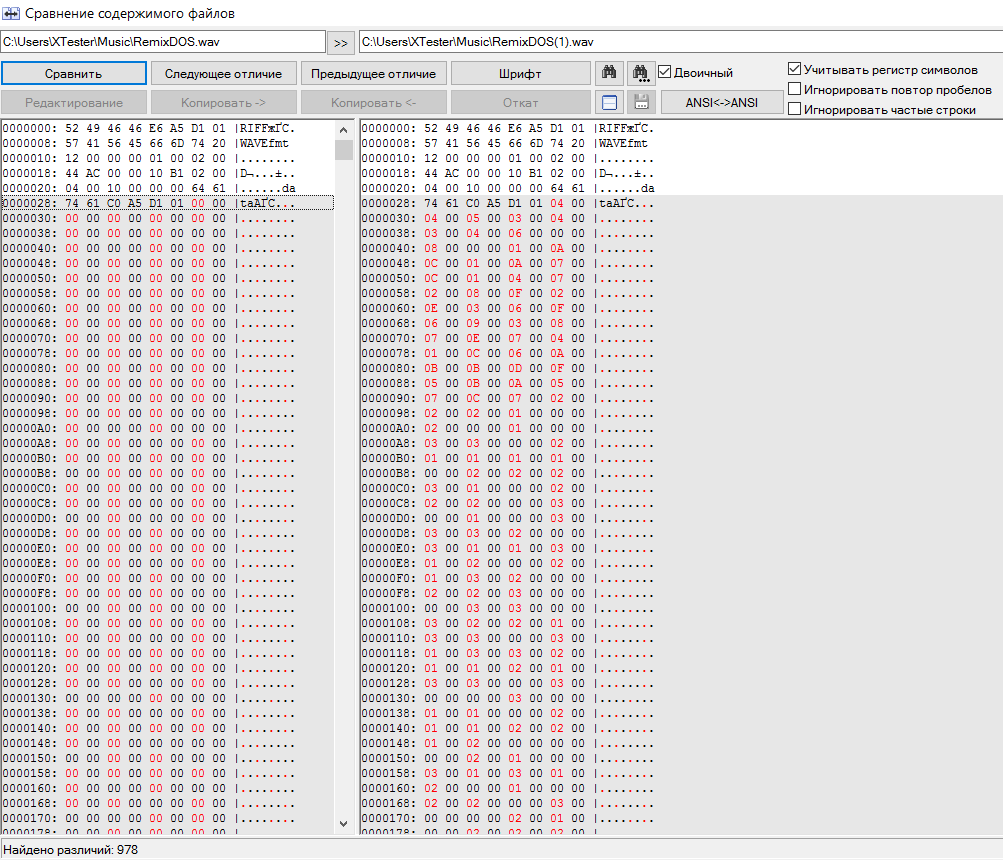 Здесь нас ждет приятный сюрприз: размеры файлов идентичны, а их содержимое различается сразу после заголовка. Байты отличаются почти везде через один, причем на малые значения. Скорее всего, перед нами реализация алгоритма LSB (Least Significant Bit — наименьший значащий бит). Суть его в том, что скрываемый файл кодируется как изменения младших битов в отдельных байтах контейнера. Это приводит к небольшим искажениям (изменению оттенка пикселя в BMP и частоты звука в WAV), которые человек обычно не воспринимает. Чем больше контейнер по отношению к скрываемому файлу, тем меньше вероятность обнаружить последний. Такой алгоритм не оставляет явных указателей на наличие внедренного файла. Предположить его наличие может только статистический анализ шумов (акустических, яркостных, цветовых и прочих), но это уже совсем другой уровень стегоанализа.