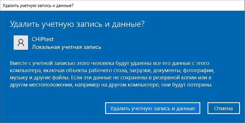 - Система спросит вас, точно ли вы хотите удалить локальную учетную запись и предупредит, что вместе с ней будут утеряны все данные на рабочем столе, в папках «Загрузка», «Документы», «Фотографии» и другие файлы учетки. Если эта информация вам не нужна, или вы уже позаботились о ее сохранении, нажмите «Удалить учетную запись и данные».