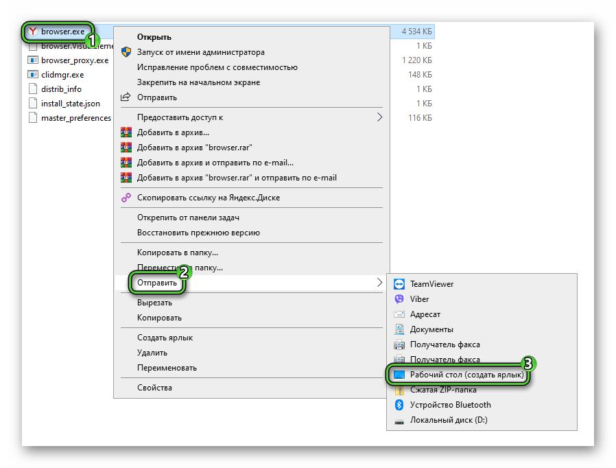 Кликните правой клавишей мыши по файлу browser.exe. В контекстном меню выберите «Отправить – Рабочий стол (создать ярлык)».