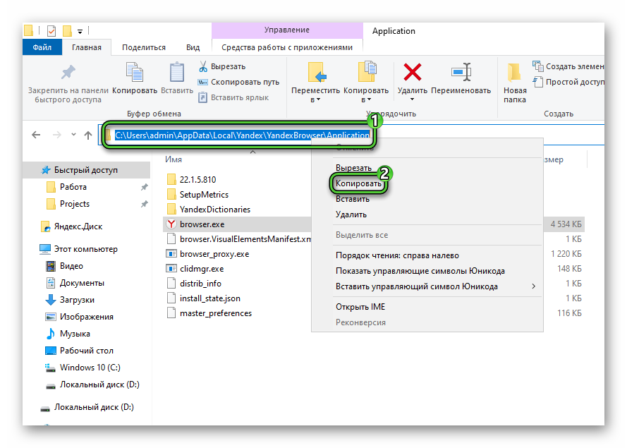 Есть еще один метод, как создать пустой ярлык и добавить для него все данные вручную. Для этого в Проводнике, в каталоге Application, где хранится файл browser.exe кликните правой клавишей мыши по адресной строке и выберите «Копировать».