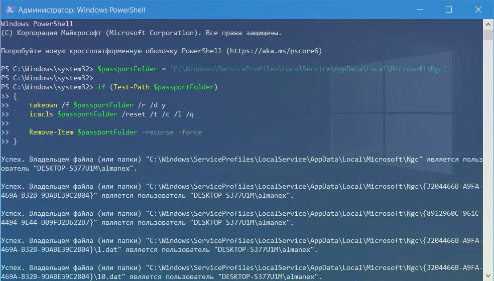 $passportFolder =‘C:\Windows\ServiceProfiles\LocalService\AppData\Local\Microsoft\Ngc’if (Test-Path $passportFolder){takeown /f $passportFolder /r /d yicacls $passportFolder /reset /t /c /l /q