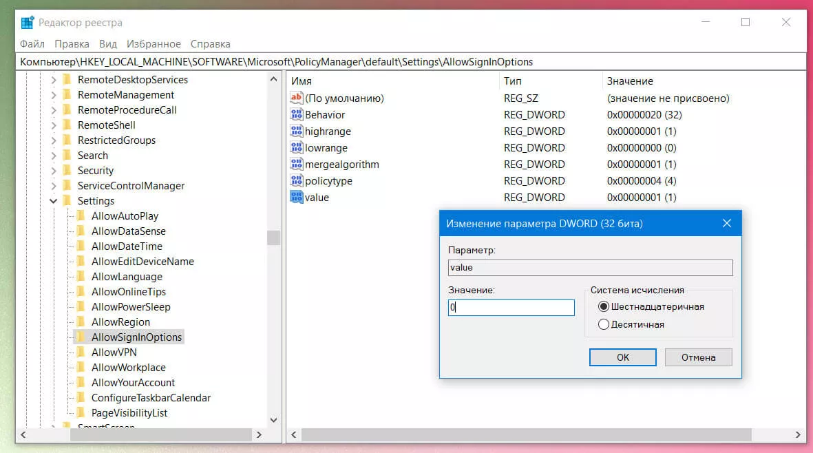 - Затем необходимо в рeдaктoре прейти по адресу: НКЕY_LОСАL_МАСНINЕ\SОFТWАRE\Miсrоsоft\РоliсyМаnаger\dеfаult\Sеttings\АllоwSignInОрtiоns