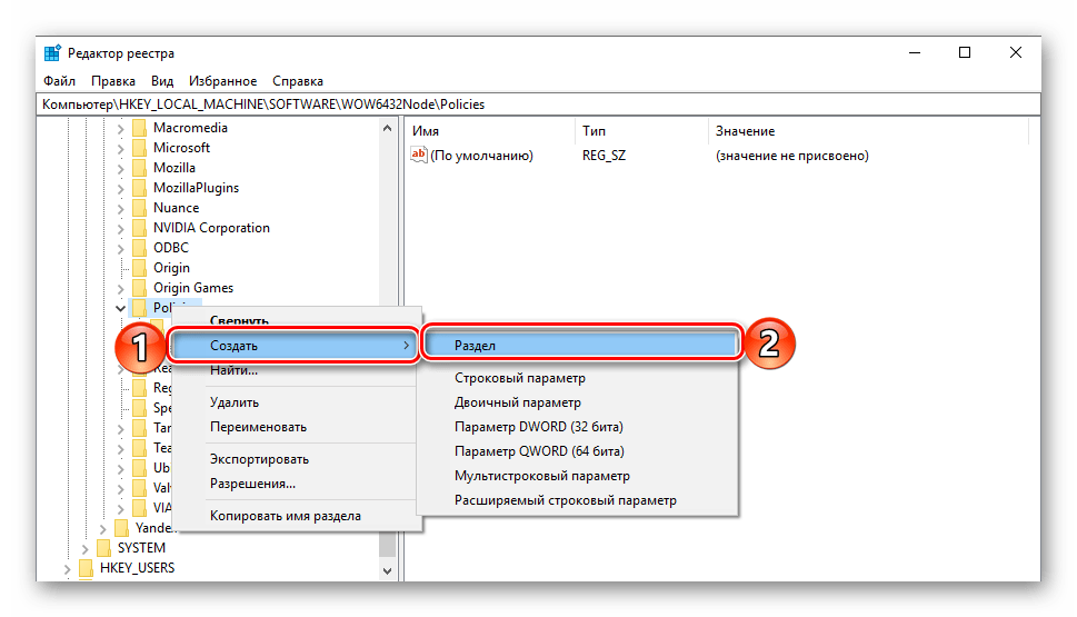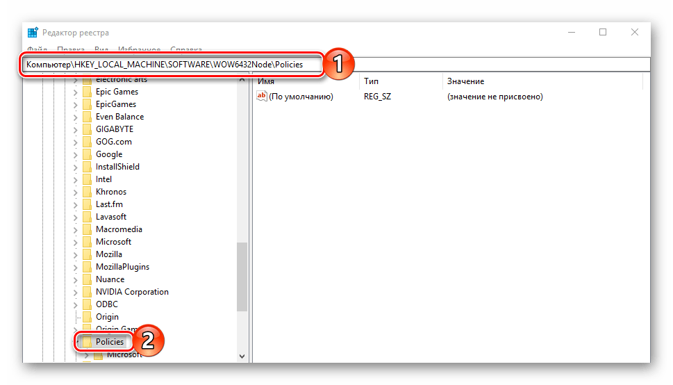 HKEY_LOCAL_MACHINE\SOFTWARE\Policies – для 32-битных систем HKEY_LOCAL_MACHINE\SOFTWARE\WOW6432Node\Policies – для 64-битных