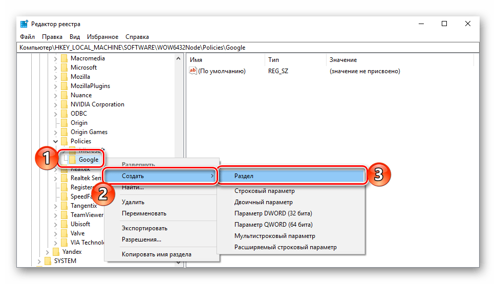 Создайте в нем раздел «Google» — для этого выделите кликом ЛКМ директорию «Policies», затем нажмите по ней же ПКМ и выберите в пеню пункты «Создать» — «Раздел». Назовите его «Google» и тоже выделите кликом.