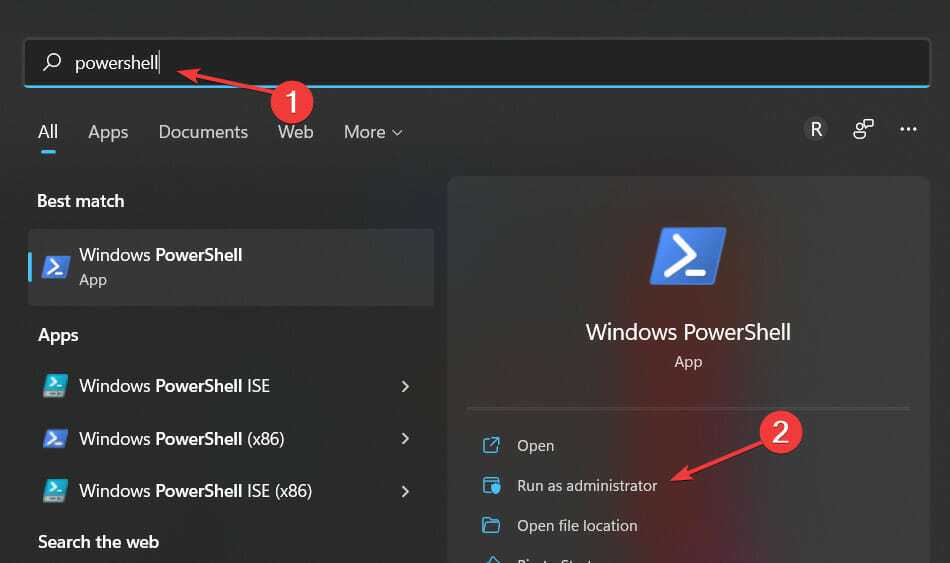 2. Type powershell in the search box and right click on the first result > select Run as administrator.