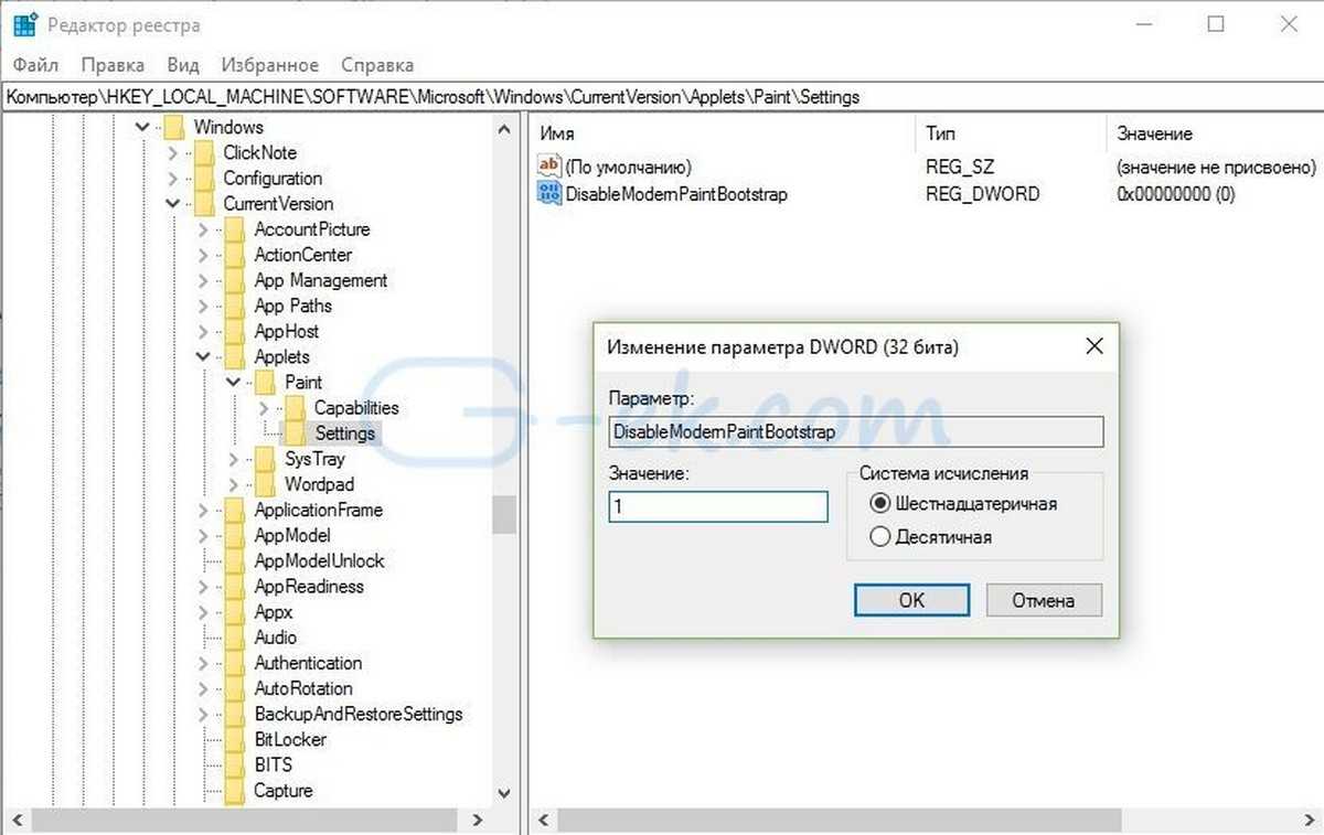 - Создайте 32-битный параметр DWORD с именем DisableModernPaintBootstrap установив его значение равным 1.