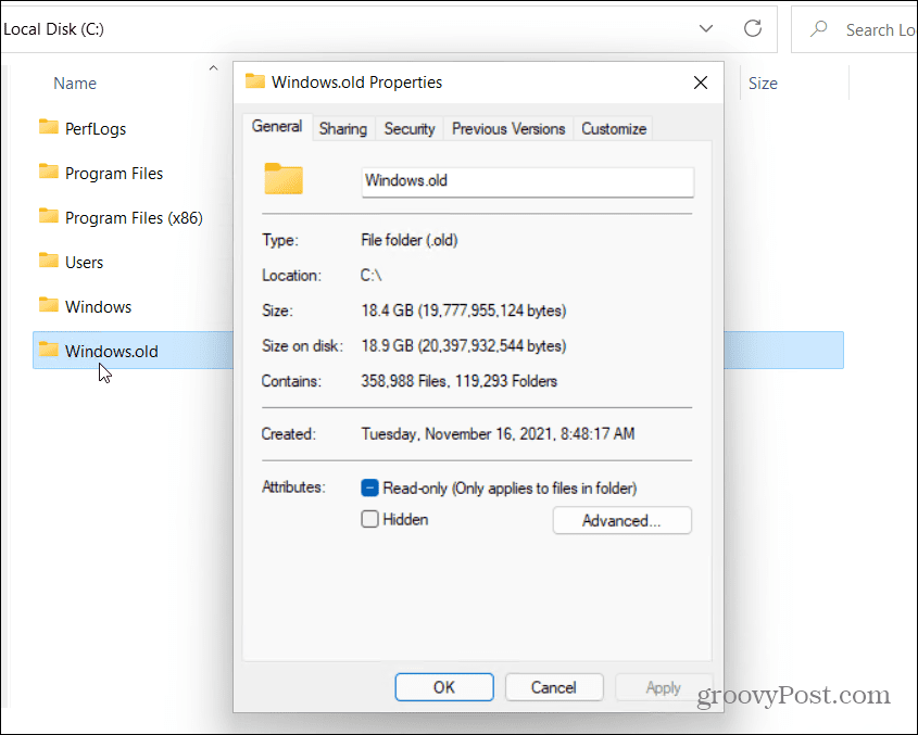 Windows.старый Характеристики окно покажет вам текущий размер папки. Это будет варьироваться в зависимости от размера предыдущей установки, но ожидайте, что эта папка будет использовать 15 ГБ или более дискового пространства.