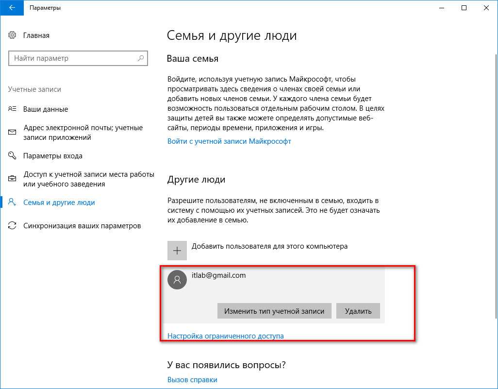 В открывшемся окне “Параметры Windows” выберите раздел “Учетные записи”. В окне “Учетные записи” перейдите в раздел “Семья и другие люди” выберите учетную запись и нажмите на кнопку “Удалить”