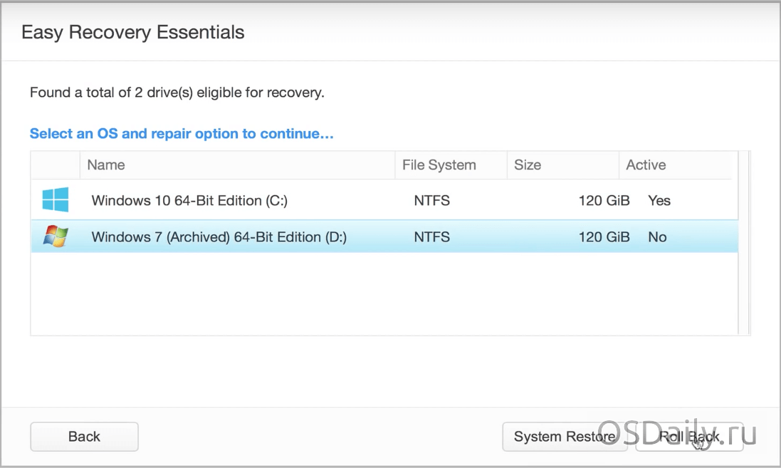 - Среди доступных систем (как правило, это Windows 10, которую можно восстановить, и 7/8.1, на которую можно откатиться) нужно выбрать старую версию ОС и нажать кнопку Roll Back.