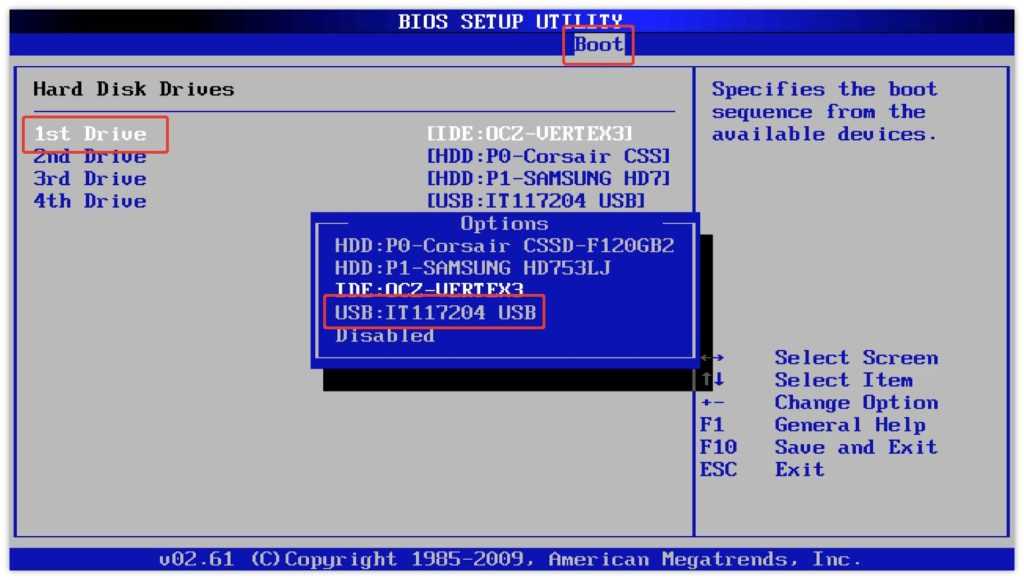 Для того, чтобы наша флешка (в данном случае она стоит четвертой в списке) была на первом месте, мы должны нажать на первую строчку в списке клавишей “Enter” и стрелочками на клавиатуре выбрать флешку и заново нажать “Enter”. Таким образом, мы выставляем нашу загрузочную флешку приоритетной для загрузки.