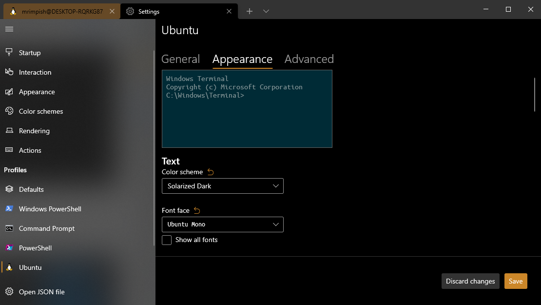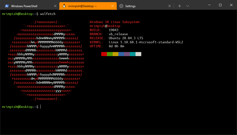 Windows Terminal allows you to open multiple Terminal instances as tabs, so you can have PowerShell running alongside Ubuntu. It also includes a number of customisation options. In the below screenshot, we’ve changed the tab name and colour, and configured the terminal appearance to use the Tango Dark theme and the Ubuntu font!
