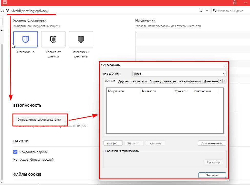 Необходимо зайти в настройки браузеров — центр сертификации.