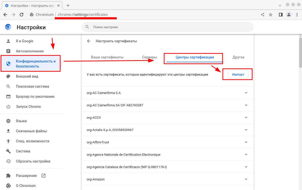 Установка сертификатов в браузер Chromium, Google-Chrome и Vivaldi