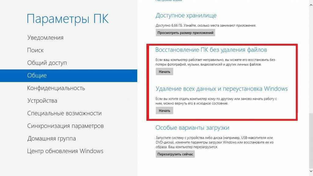 В результате должно появиться нужное нам окошко «Параметры ПК». Теперь остается только найти в нем раздел «Общие», открыть его и выбрать необходимый вариант восстановления виндовс 8: