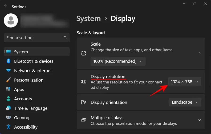 Теперь прокрутите вниз до Разрешение экрана и щелкните раскрывающееся меню.