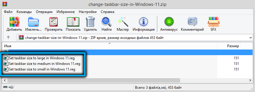 Файлов будет три, один – для уменьшения размеров панели задач (в его названии присутствует слово small), один – для увеличения (large) и ещё один – для установки дефолтного размера значков панели задач (medium). Желательно не удалять эти файлы, чтобы иметь возможность быстро изменить параметры показа панели.