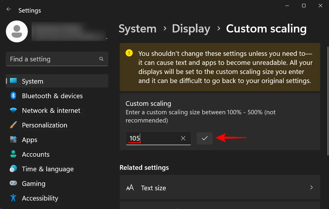 Теперь рядом с Custom scaling введите новое число (чем меньше, тем лучше). Если вы хотите, чтобы значки были маленькими, убедитесь, что процентное значение ближе к 100%. Затем нажмите на галочку рядом с ним для подтверждения.