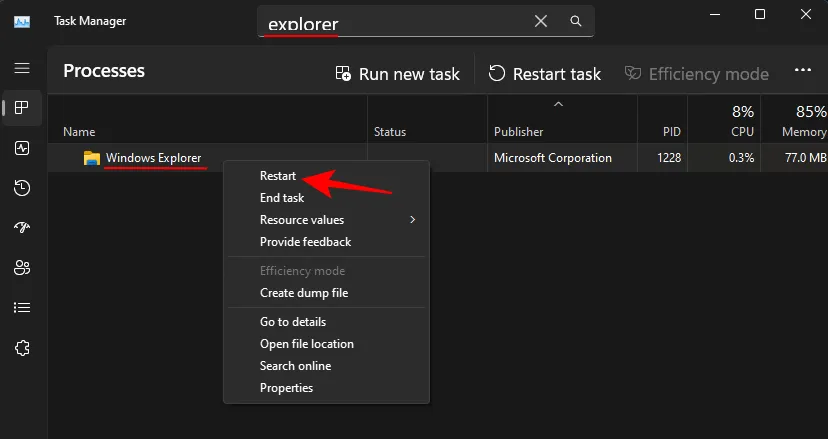 Чтобы эти изменения вступили в силу, вам придется перезапустить проводник Windows. Для этого нажмите, чтобы открыть диспетчер задач.
