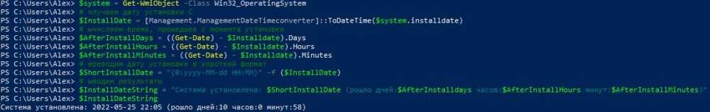 $InstallDateString = «Система установлена: $ShortInstallDate (Прошло дней:$AfterInstalldays часов:$AfterInstallHours минут:$AfterInstallMinutes)»