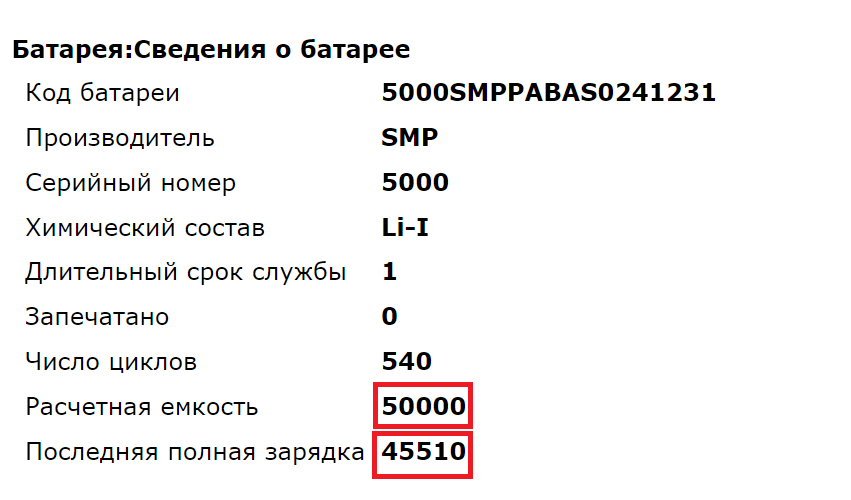 Чтобы узнать износ аккумулятора в процентах потребуется расчетная емкость или базовая емкость аккумулятора (задается производителем аккумулятора) и показатель последней полной зарядки (отображает реальную емкость аккумулятора на последний момент зарядки). Вычисляем износ по формуле: (50000 — 45510)/50000 = 0,0898 * 100 = 8,98 округляем до 9%. Износ моего аккумулятора составляет 9%.