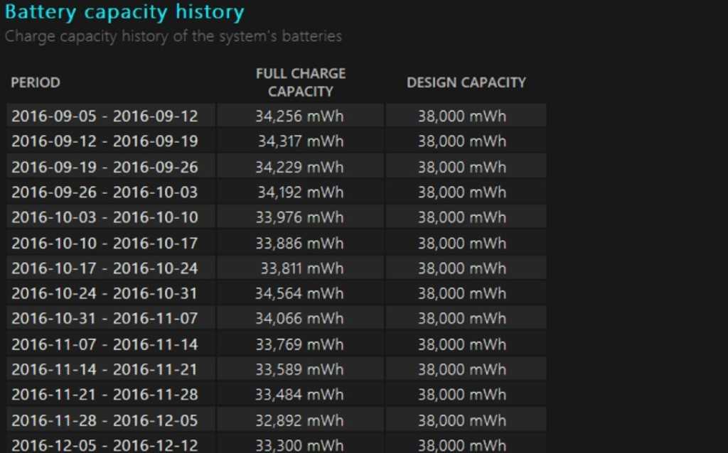 - «Battery capacity history». Здесь отображается информация об уровне деградации батареи с течением времени. Проанализировав данные графы «Full Charge Capacity» можно проследить постепенное уменьшение емкости аккумулятора, указанной в mWh (миливатт-час) за весь период использования.