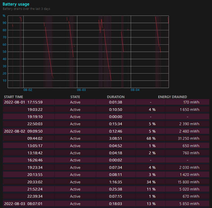 - В следующем разделе показано, как устройство расходовало энергию аккумулятора в течение последних трех суток.