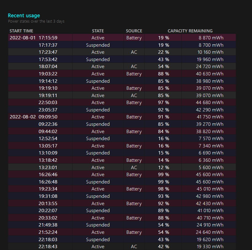 Данный отчет позволит вам ознакомиться со всей важной информацией касательно батареи вашего ноутбука. В разделе «Recent Usage» вы сможете найти сведения о том, когда в последние дни ваш компьютер был включен или выключен, а также узнать остаточную емкость батареи
