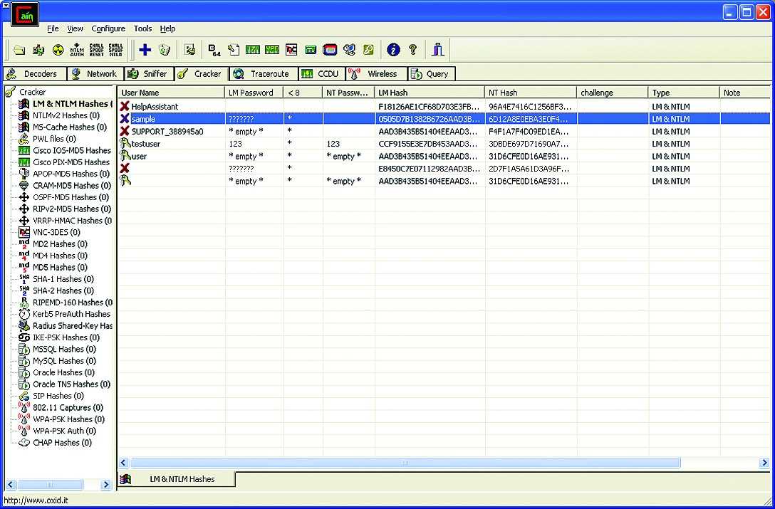 insidepro.com/rus/saminside.shtml Пожалуй, самая популярная программа для взлома NTLM-хешей. Позволяет импортировать свыше десяти типов данных и использовать шесть видов атак для восстановления паролей пользователей.Код брутфорсера полностью написан на асме, что обеспечивает очень высокую скорость перебора