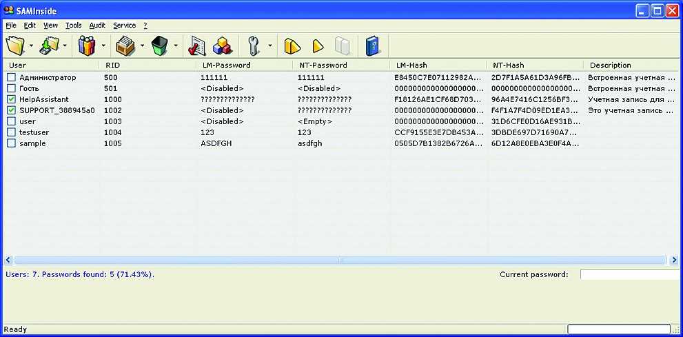 - Все, теперь эти файлы можно скормить какой-нибудь утилите типа SAMInside для расшифровки полученных хешей.