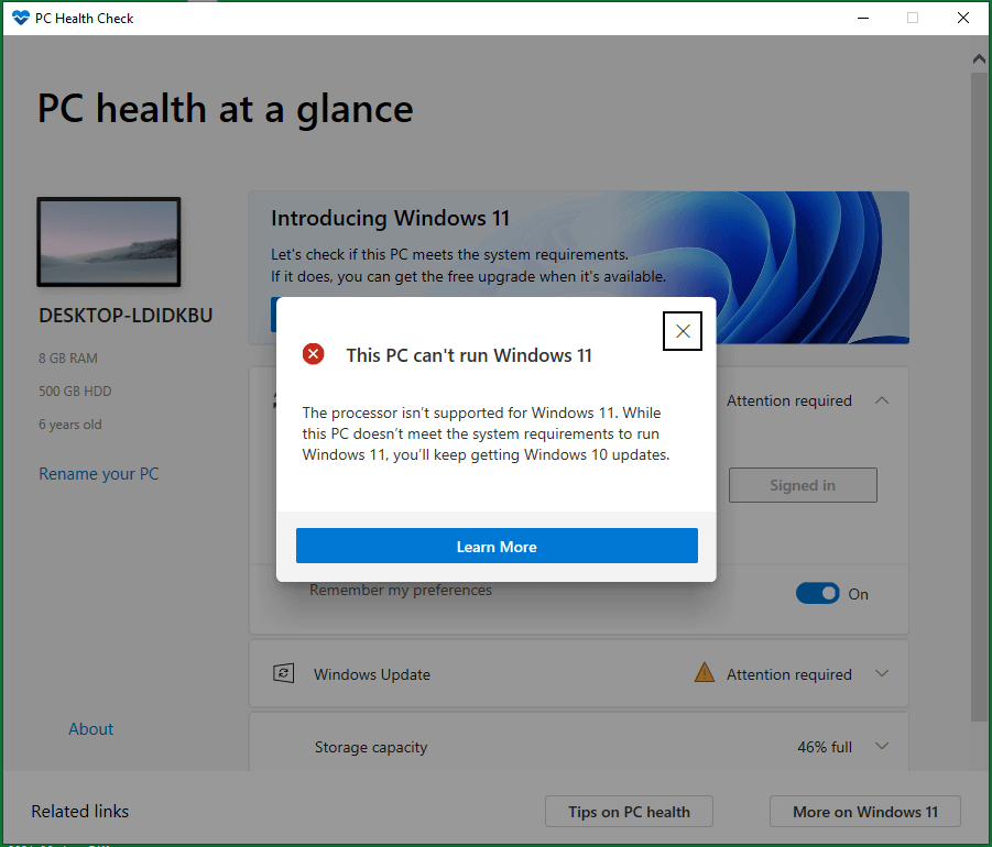Вы так же можете выполнить проверку с программой «PC Health Check» от Microsoft, но она работает с перебоями.