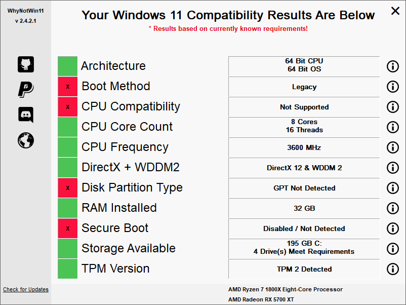 Если по какой-то причине вы не хотите использовать приложение от Microsoft или у вас просто не работает PC Health Check, то есть альтернатива с похожей функциональностью. На GitHub была обнаружена open-source программа WhyNotWin11, которая наглядно показывает, какие из компонентов ПК не соответствуют требованиям новой операционной системы Microsoft. Дизайн этой программы немного скромнее, но с точки зрения полезности он выглядит более практичным решением. Так что рекомендуем.