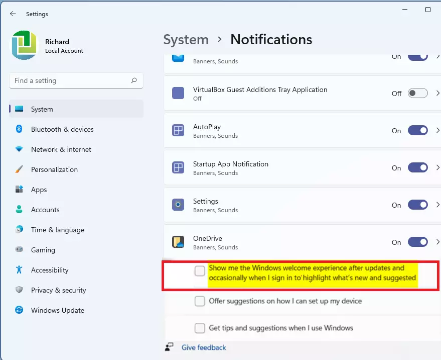 В панели настроек Уведомления , снимите флажок, который гласит: Покажите мне приветствие Windows после обновлений и время от времени, когда я вхожу в систему, чтобы выделить то, что есть и предложено.Чтобы отключить эту функцию.