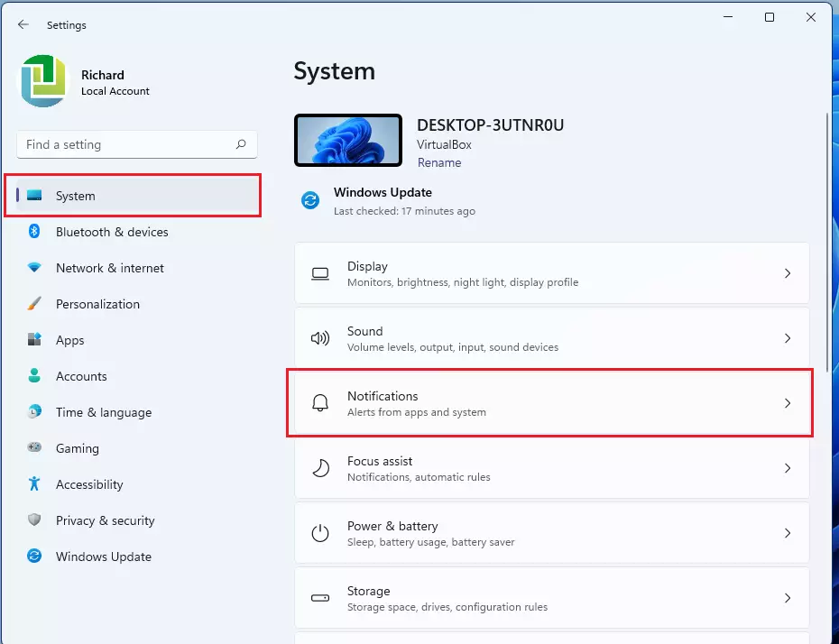 Панель настроек Windows должна выглядеть примерно так, как показано на рисунке ниже. В настройках Windows нажмите Система, Затем выберите Уведомления Поле на правой панели, как показано на изображении ниже.