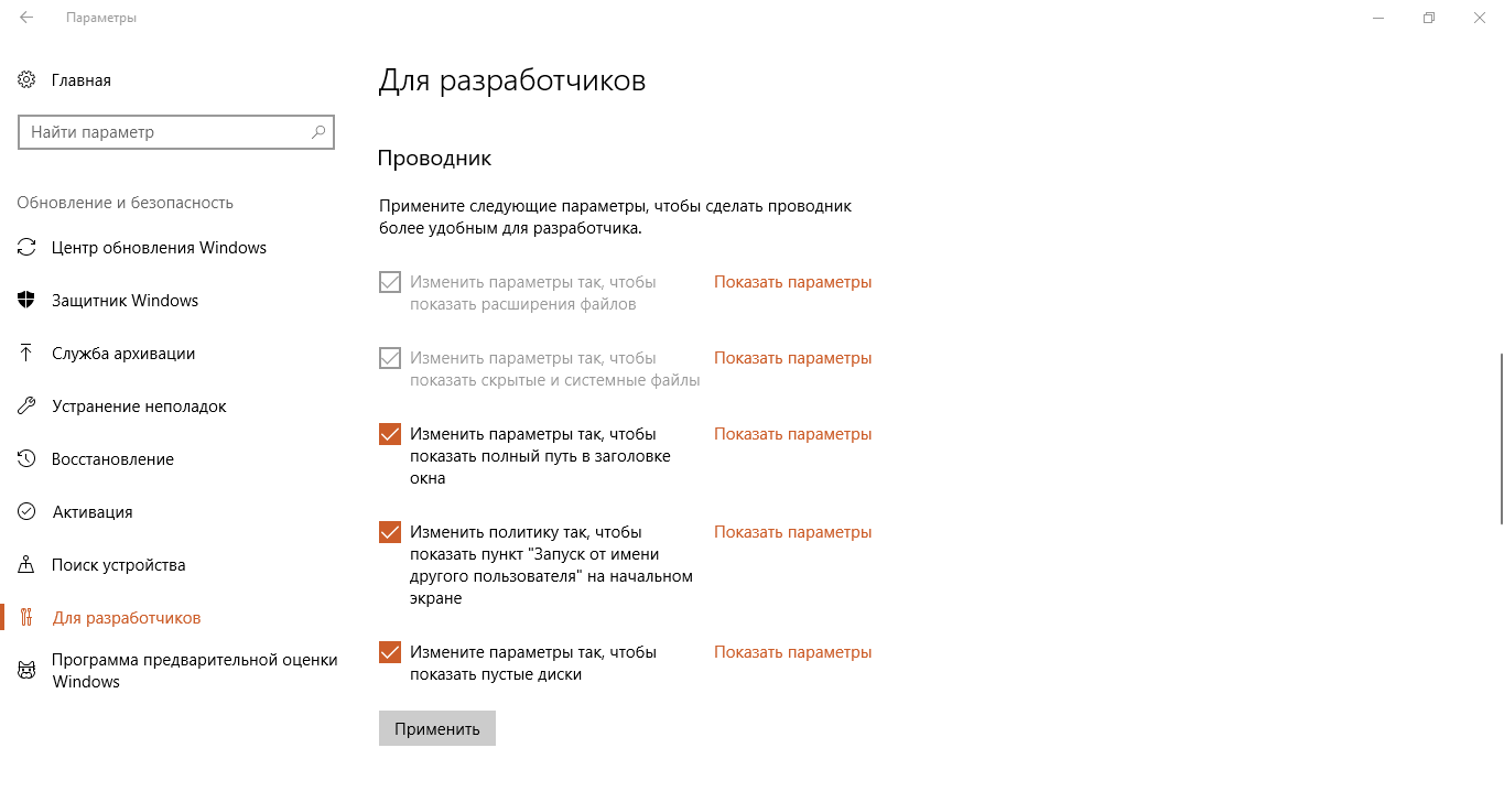 Для каждого раздела есть своя кнопка «Применить»: после изменения параметров в нём необходимо обязательно на неё нажать, чтобы все указанные значения вступили в силу. Справа от каждого пункта есть ссылка «Показать параметры». Если вдруг сам параметр некликабелен, нажмите на неё — откроется то или иное окно Windows, которому он соответствует в системе, и измените настройки там.