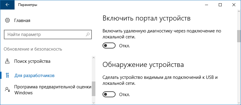 Деактивируют среду для айтишников одним из способов, как и при запуске. В «Параметрах» отключить эту опцию юзер может через «Обновление и безопасность». Нажав на строку «Для разработчиков», убрать отметки с разрешений. Затем перезапустить систему.