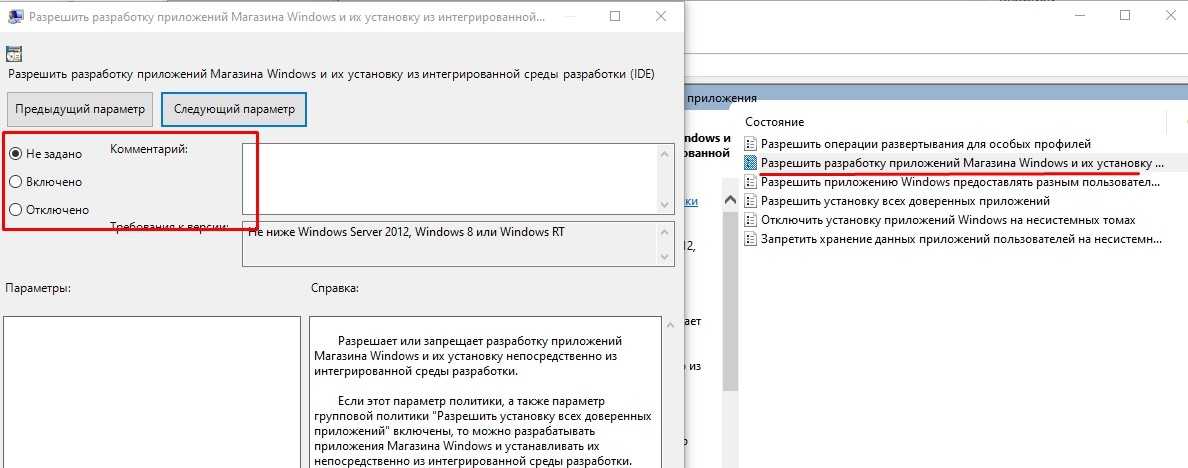 Этот параметр разрешает или запрещает разработку приложений Магазина Windows и их установку непосредственно из интегрированной среды разработки. Если ещё включён параметр установки всех доверенных приложений, то можно устанавливать appx-приложения.