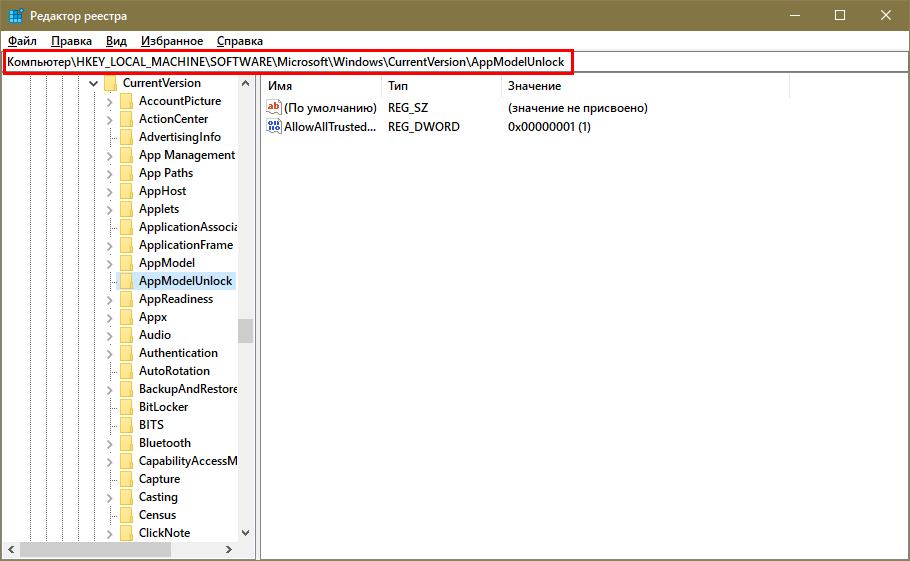 Следуйте по пути: HKEY_LOCAL_MACHINE \ SOFTWARE Microsoft \ Windows \ CurrentVersion \ AppModelUnlock.