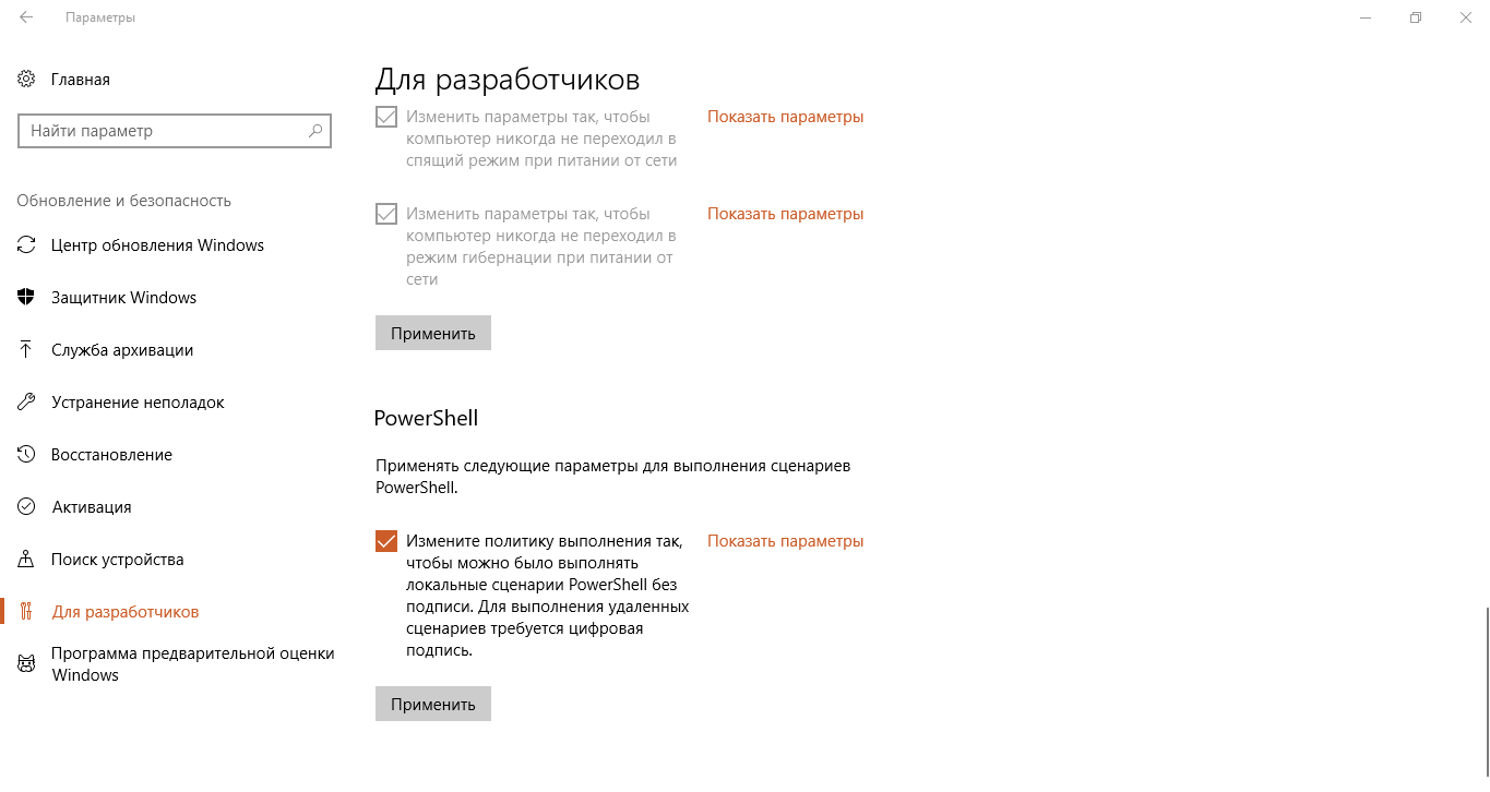 В целях безопасности консоль PowerShell принимает и выполняет команды только с цифровой подписью. «Режим разработчика» предполагает тестирование различных скриптов, поэтому в нём проверка выполнения локальных скриптов отключается.