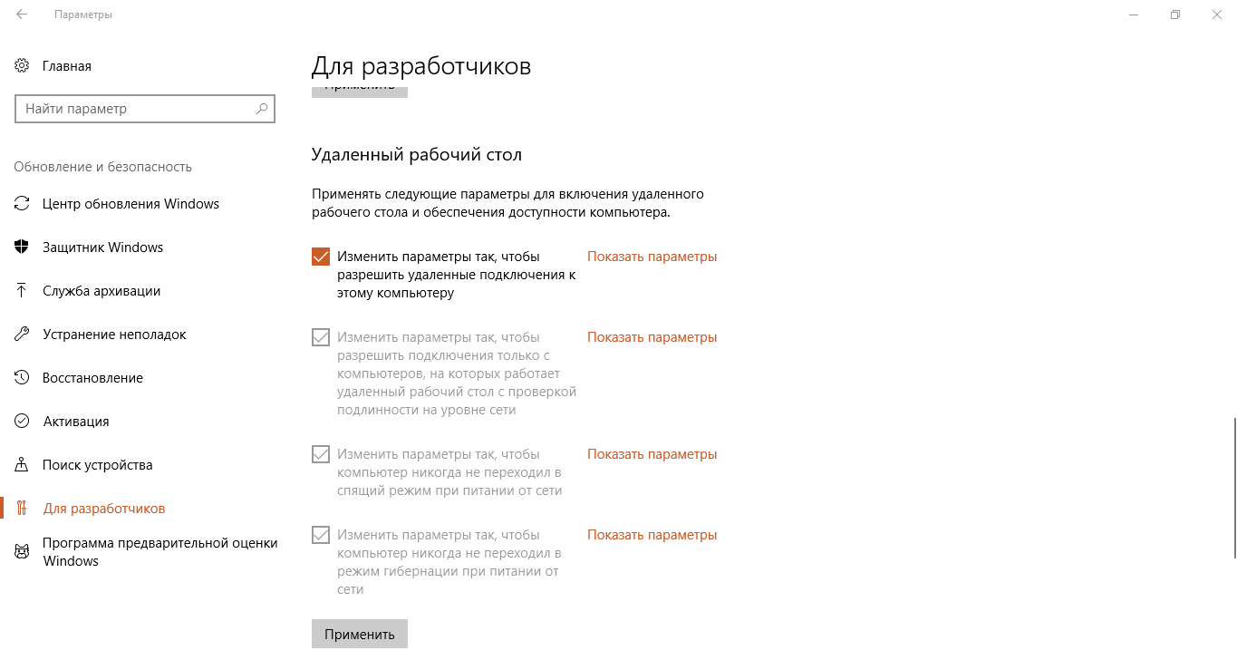 Чтобы у пользователя всегда был доступ к своему удалённому «Рабочему столу», он может отключить переход на «Спящий режим» или «Гибернацию», если компьютер питается не от аккумулятора, а от сети.